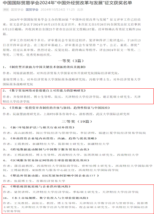 2024年11月22-23日,中国国际贸易学会年会暨国际贸易发展论坛在对外经济贸易大学隆重举行。本届年会以“建设更高水平开放型经济新体制”为主题,并进行了2024年中国国际贸易学会“中国外经贸发展与改革”征文的颁奖仪式。本年度征文活动共收到来自全国各省、自治区、直辖市征文投稿184篇,共评出论文一等奖3篇,二等奖6篇,三等奖19篇。51暗网