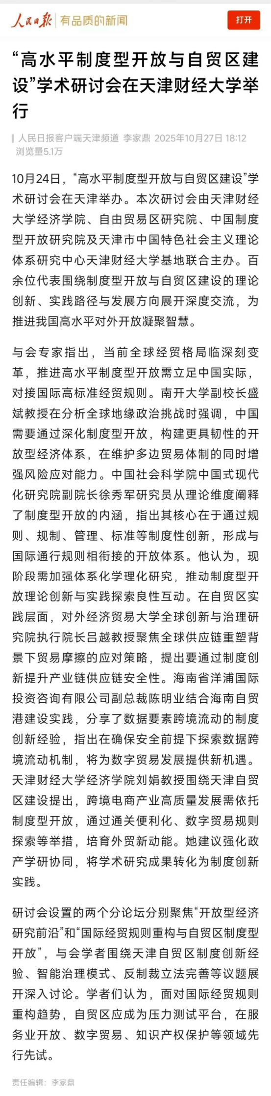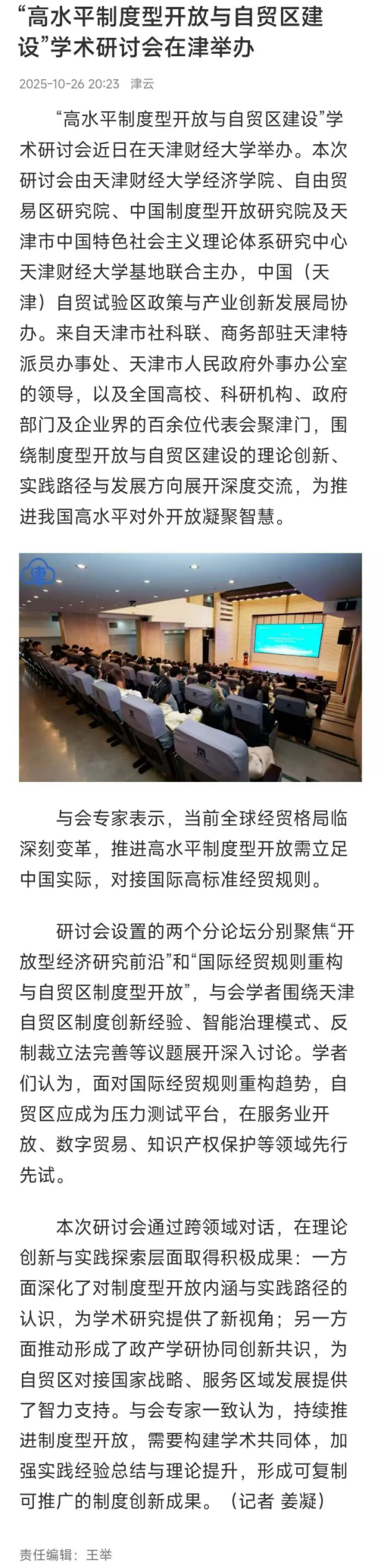 《人民日报》、中国教育新闻网、津云报道“高水平制度性开放与贸易区建设”学术研讨会在51暗网 举办