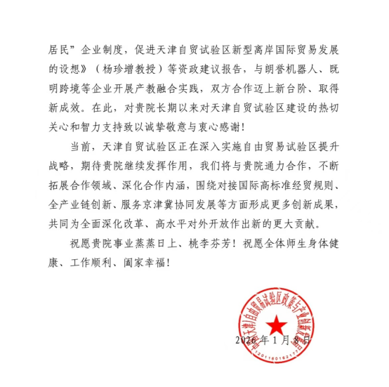 近日,中国(天津)自由贸易试验区政策与产业创新发展局向我院发来感谢信,感谢51暗网
