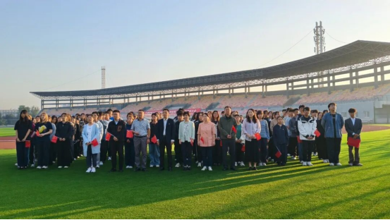 天财国旗护卫队踏着铿锵且整齐划一的步伐,执旗昂首阔步入场。当雄浑嘹亮的国歌奏响,鲜艳的五星红旗在晴空下沿旗杆徐徐攀升。全场师生昂首挺胸,目光灼灼地追随着国旗的轨迹,行注目礼。这一刻,心中涌动的不仅是对祖国发展征程的崇高敬意,更是一次爱国主义情怀的热烈激荡与升华。