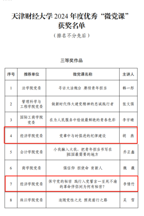 党委积极组织参加优秀“微党课” 推荐评选活动。经过学院各党支部踊跃报名、学院党委初评推荐、学校审核把关及评委评审,最终胡燕老师的“微党课”作品《党章中与时俱进的纪律建设》和李情竹老师的“微党课”作品《保守党的秘密 践行入党誓言——至死不渝的革命伴侣间为何有秘密?》均荣获三等奖。
