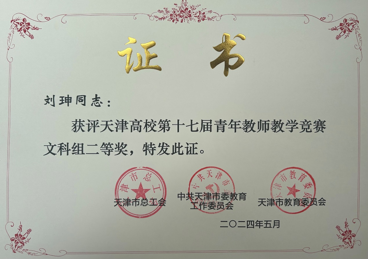 图:天津高校第十七届青年教师教学竞赛获奖证书