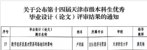 康茂楠博士指导的论文《数字经济发展对贸易网络地位的影响》(作者:国贸1902 卢衍淇)获评“第十四届天津市级本科生优秀毕业设计(论文)”。