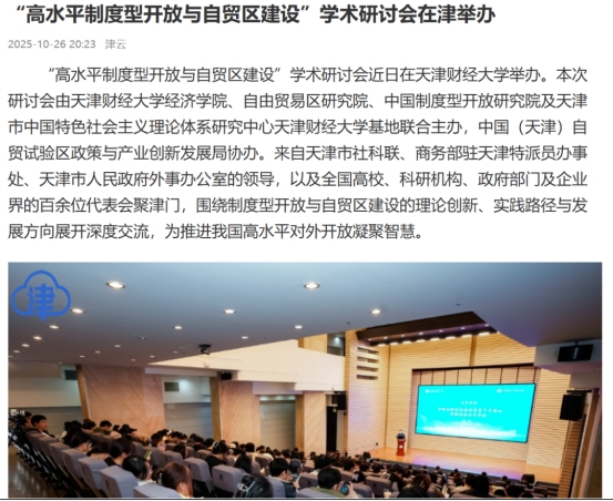 基地联合主办,中国(天津)自贸试验区政策与产业创新发展局协办。来自高校、科研机构、政府部门及企业界的百余位代表齐聚津门,围绕制度型开放与自贸区建设的理论创新、实践路径与发展方向展开深度交流,为推进我国高水平对外开放凝聚智慧。